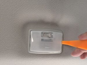 リヤラゲッジルームランプのレンズ部を、切り欠きに樹脂リムーバーや、マイナスドライバーを差し込み外します。
